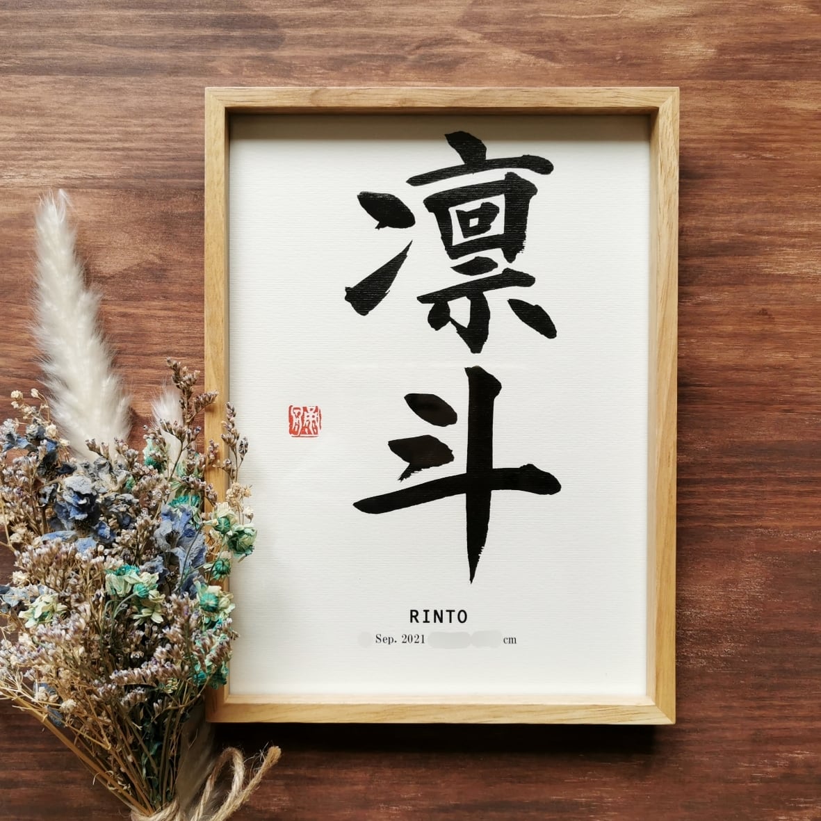 お部屋に馴染む、木製フレームの命名書です。